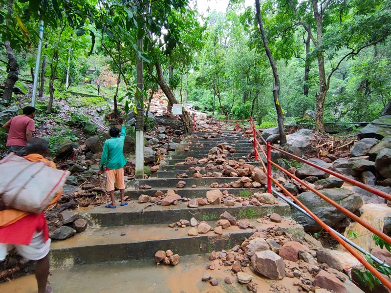 मंगलवार सुबह हुई तेज बारिश की वजह से पहाड़ के पानी की दिशा बदल गई और वह सीढ़ियों के रास्ते मुख्य गेट से होते हुए नीचे सड़क तक आ पहुंची। कुदरगढ़ के मुख्य प्रवेश द्वार के पास भी बड़े-बड़े पत्थर आ गए हैं। सीढ़ियों में पत्थर गिरे रहने के कारण रास्ता भी जाम हो गया है।