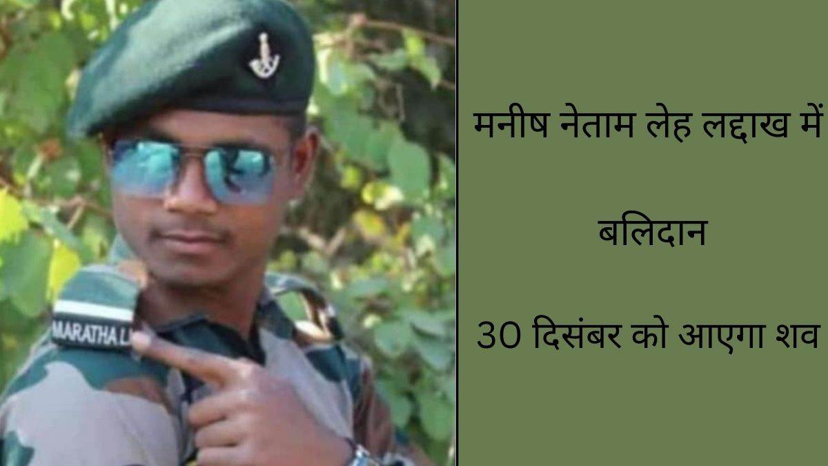 धमतरी जिला मुख्यालय से करीब 10 किलोमीटर की दूरी पर ग्राम पंचायत खरेंगा है। यहां के मनीष नेताम पुत्र राजेन्द्र नेताम 24 वर्ष पिछले तीन सालों से सेना में भर्ती होकर देश सेवा कर रहे हैं। वर्तमान में वह देश के लेह-लद्दाख सीमा पर ड्यूटी कर रहे थे। 28 दिसंबर की सुबह लेह-लद्दाख में ड्यूटी के दौरान उन्हें अचानक सांस में तकलीफ हुआ। अन्य जवानों ने उन्हें उपचार के लिए अस्पताल पहुंचाया, जहां डाक्टरों ने उन्हें मृत घोषित कर दिया। जवान मनीष नेताम के बलिदान होने की जानकारी सेना के माध्यम से घर में दी गई। इस खबर के मिलते ही गांव में शोक की लहर छा गई है। गांव के सुभाष साहू और हिरेन्द्र साहू ने बताया कि बलिदान का शव 30 दिसंबर को गांव में पहुंच जाएगा, इसके बाद राजकीय सम्मान के साथ उनका अंतिम संस्कार किया जाएगा। इधर शहीद के माता-पिता को अपने इकलौते बेटे के शव आने का इंतजार है।