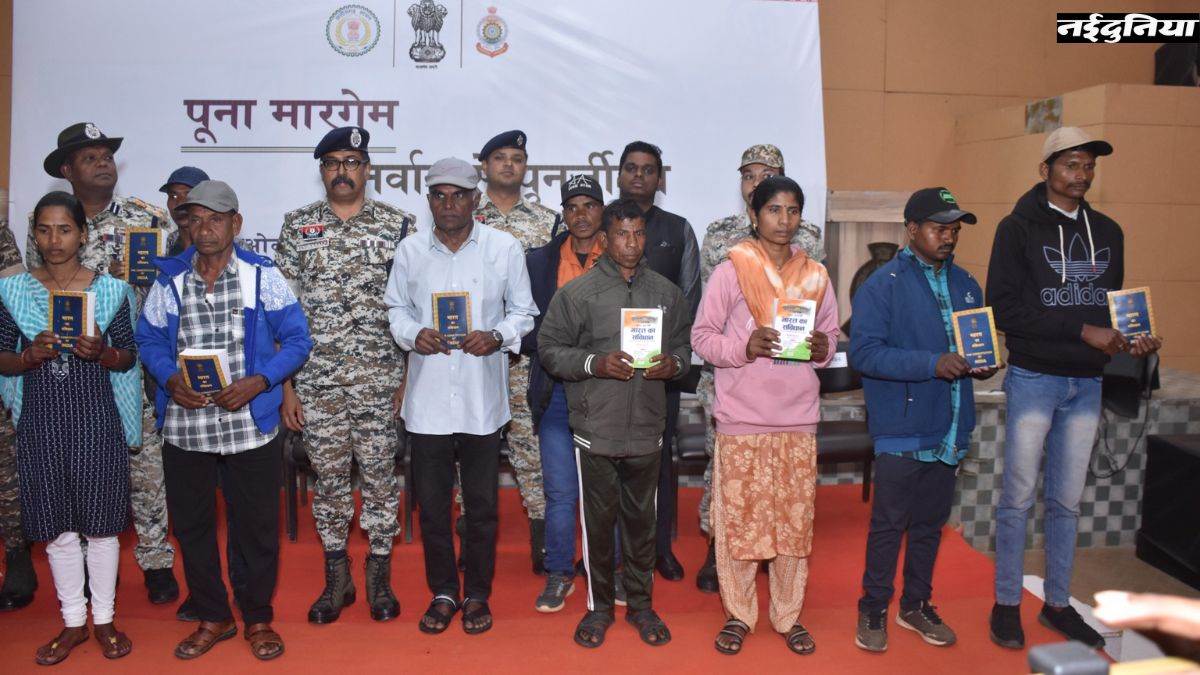इसके अलावा आठ लाख का इनामी डीवीसीएम सरोज, पांच-पांच के इनामी एसीएम भूपेश, प्रकाश, कमलेश, जन्नी, संतोष, रामशीला व एक-एक लाख के पार्टी सदस्य नवीन, जयंति ने शौर्य भवन, पुलिस कोऑर्डिनेशन सेंटर में बस्तर रेंज आईजी सुंदरराज पी., एसपी शलभ सिन्हा, सीआरपीएफ व एसटीएफ के अधिकारियों और आदिवासी समाज के वरिष्ठ प्रतिनिधि की उपस्थिति में हथियार छोड़कर संविधान की किताब थामी।