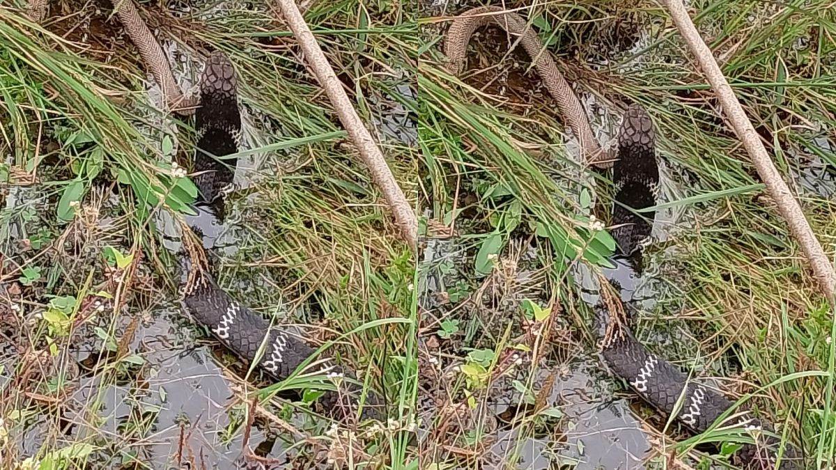 नईदुनिया प्रतिनिधि, कोरबा। जिले के ग्राम कोरकोमा के ग्रामीणों के लिए वह क्षण कौतूहल भरा रहा जब किसान के खेत में किंग कोबरा को सांप का शिकार करते देखा। 16 फीट लंबा किंग कोबरा अपने मुंह में छह फीट गेहुंअन सांप को दबोच रखा था। देखते ही देखते कोबरा दूसरे सांप को निगल कर खेत के निकट झुरमुट में छुप गया। लोगों ने इसका वीडियो बना लिया अब वह जमकर वायरल हो रहा है।