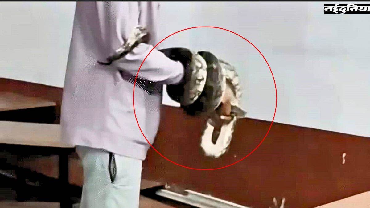शनिवार सुबह करीब 10 बजे आत्मानंद पब्लिक स्कूल में गणित की क्लास चल रही थी। एक छात्रा के बेंच के नीचे आठ फीट का विशालकाय अजगर कुंडली मारकर बैठा था। अजगर की फुंफकार सुनकर क्लास में अफरा-तफरी मच गई। शिक्षक और छात्र तुरंत क्लासरूम से बाहर निकल आए।