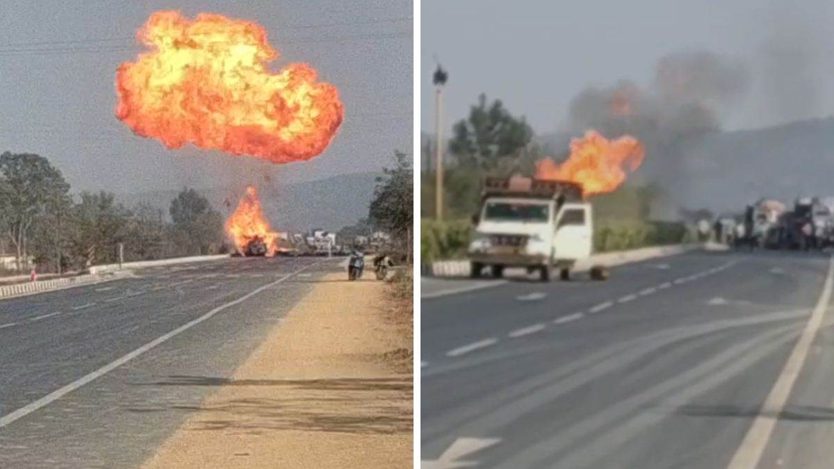 CG में NH-53 पर गैस सिलेंडरों से भरी पिकअप में भीषण आग, धमाकों से मची अफरा-तफरी... आग का गोला बना वाहन