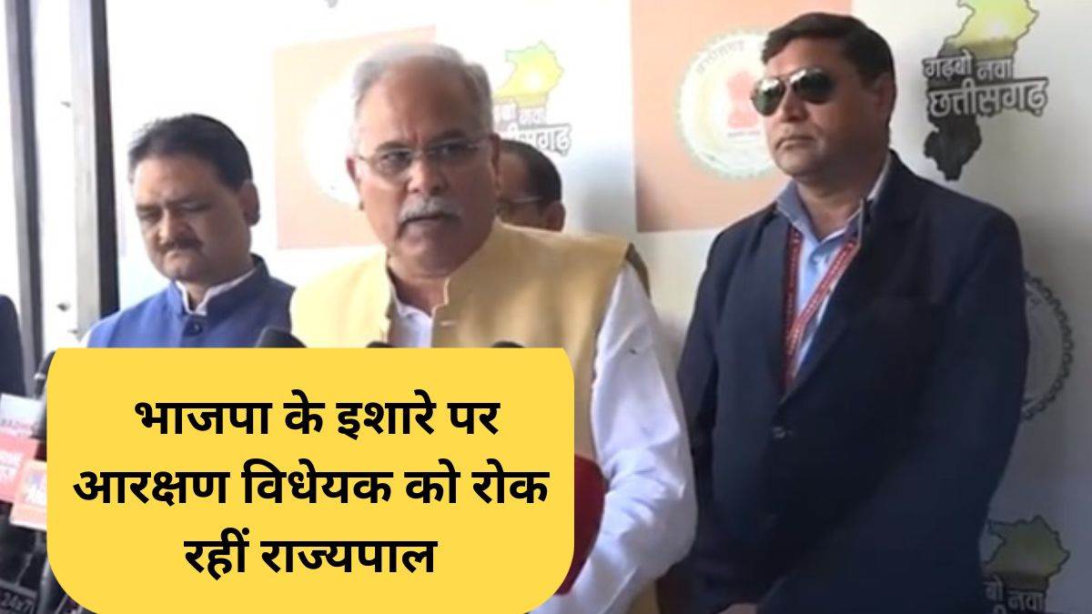 आरक्षण संशोधन विधेयक पर राज्यपाल के हस्ताक्षर न करने से बिफरे मुख्यमंत्री भूपेश बघेल ने कहा है कि भाजपा प्रदेश के लोगों का हित नहीं चाहती। इंटरनेट मीडिया पर एक वीडियो पोस्ट कर बघेल ने कहा कि भाजपा जनता के बीच विलेन नहीं बनना चाहती थी, लेकिन पीछे के दरवाजे से राजभवन के माध्यम से आरक्षण विधेयक को रोक रही है। भाजपा कभी प्रदेश के लोगों का हित नहीं चाहती। न आदिवासी न किसान, न बच्चों, न महिलाओं न मजदूरों किसी का नहीं। 15 साल में हमने देखा है। मुख्यमंत्री ने कहा कि सारे सार्वजनिक उपक्रम बेच रहे हैं, उन जगहों पर कर्मचारी की जरुरत पड़ती, उनको आरक्षण का लाभ मिलता, लेकिन सब प्राइवेट कर रहे हैं। भाजपा आरक्षण खत्म करने का खेल चला रही है।