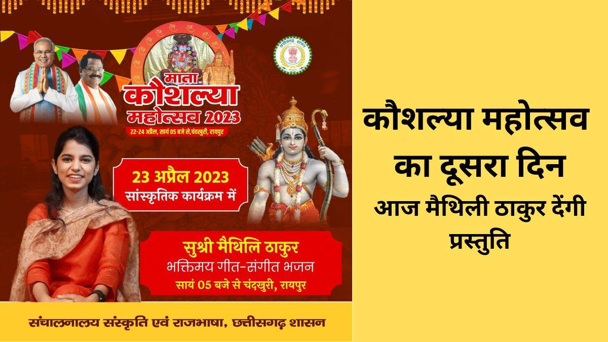 रायपुर। Kaushalya Mahotsav in Raipur आज रविवार को कौशल्या महोत्सव का दूसरा दिन है। जहां लोकगीत गायिका मैथिली ठाकुर के भक्ति में गीत संगीत भजन की प्रस्तुति होगी। मूलतः बिहार की रहने वाली मैथिली ठाकुर ने देश के युवा वर्ग में अपने गीत-संगीत से एक अलग पहचान बनायी है और पूरा देश उनके गीत-संगीत का कायल है। महोत्सव के दूसरे दिन मुंबई की मशहूर गायिका कविता पौडवाल के भक्तिमय भजनों की भी प्रस्तुति होगी। इसके साथ ही वाराणसी से आए व्योमेश शुक्ल द्वारा श्री राम की शक्ति पूजा की प्रस्तुति महोत्सव के मंच से की जाएगी। इन दोनों कलाकारों की प्रस्तुति महोत्सव के पहले दिन होनी थी, लेकिन खराब मौसम की वजह से इनकी प्रस्तुति आज महोत्सव के दूसरे दिन होगी।