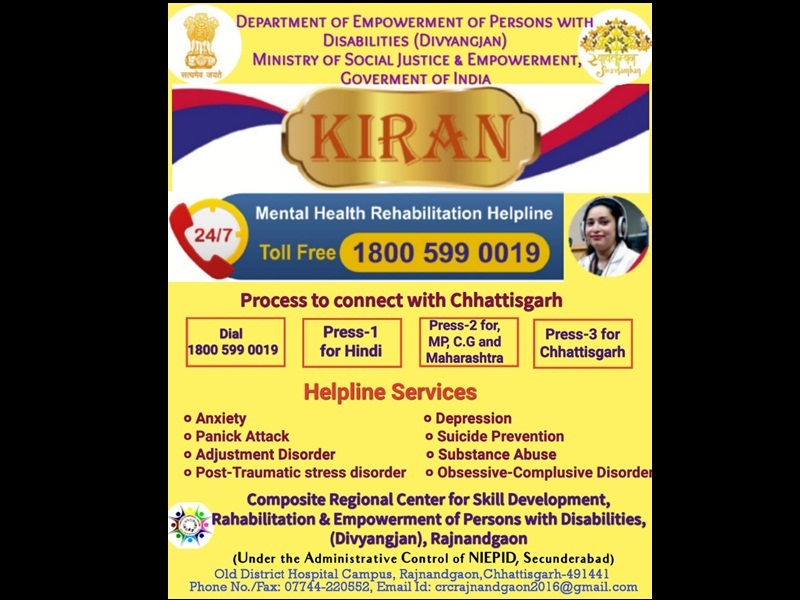 मुख्य चिकित्सा एवं स्वास्थ्य अधिकारी डा. मिथलेश चौधरी ने बताया कि मनोविकार से पीड़ितों की उपचार संबंधी सहायता के लिए भारत सरकार द्वारा किरण नाम से एक हेल्पलाइन सेवा शुरू की जा रही है। कौशल विकास, पुनर्वास और व्यक्तियों के सशक्तीकरण के लिए पूरा कार्यक्रम दिव्यांगजन मिश्रित क्षेत्रीय केंद्र, राजनांदगांव की ओर से पुराना जिला अस्पताल परिसर में आयोजित किया जाएगा। किरण योजना से छत्तीसगढ़ में जुड़ने के लिए भारत सरकार के दिव्यांगजन सशक्तीकरण विभाग, सामाजिक न्याय एवं अधिकारिता मंत्रालय की ओर से बाकायदा प्रकिया भी स्पष्ट की गई है, जिसके अंतर्गत सबसे पहले हेल्पलाइन टोल फ्री नंबर-1800 599 0019 डायल करना होगा। इसके पश्चात हिंदी में संदेश सुनने के लिए मोबाइल के डायल पैड पर एक दबाना होगा।