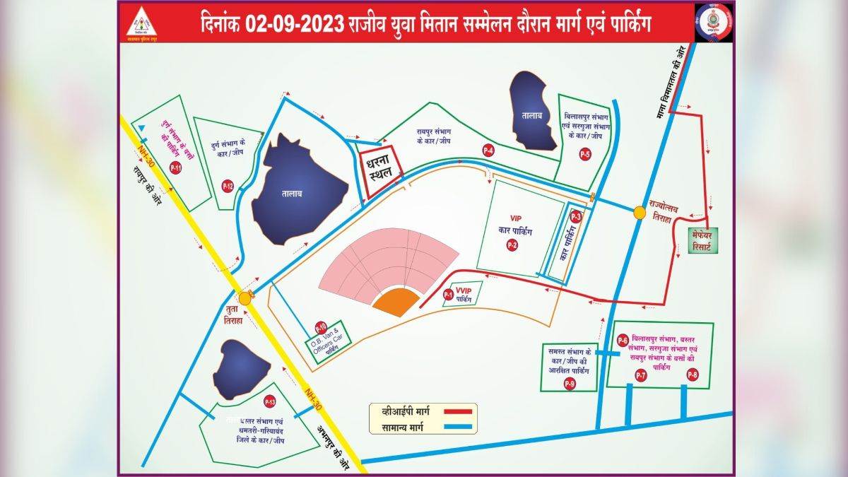 यातायात डीएसपी गुरजीत सिंह ने बताया कि सम्मेलन स्थल पर बस्तर संभाग के साथ बालोद, धमतरी, गरियाबंद और अभनपुर क्षेत्र की ओर से आने वाले वाहन केंद्री मोड से नवा रायपुर मार्ग में मुड़कर ला युनिवर्सिटी से ट्रिपल आई चौक मुक्तांगन के सामने से कार्यक्रम स्थल की ओर प्रस्थान करेंगे। वहीं बिलासपुर, सरगुजा संभाग और महासमुंद, बलौदा बाजार और रायपुर जिले के आरंग व खरोरा क्षेत्र की ओर से आने वाले वाहन मंदिर हसौद से नवागांव मोड़ से नवा रायपुर में मुड़कर क्रिकेट स्टेडियम, श्री साईं अस्पताल से दीन दयाल चौक से ट्रिपल आईटी मुक्तांगन के सामने से कार्यक्रम स्थल की ओर प्रस्थान करेंगे। रायपुर शहर व धरसींवा क्षेत्र की ओर से आने वाले वाहन सेरीखेड़ी ब्रिज से नवा रायपुर मार्ग होकर क्रिकेट स्टेडियम टर्निंग से सीधे राज्योत्सव मैदान कार्यक्रम स्थल की ओर प्रस्थान करेंगे। इसी तरह से दुर्ग और राजनांदगांव संभाग की ओर से आने वाले वाहन टाटीबंध से पचपेड़ी नाका से माना बस्ती होकर तूता की ओर से राज्योत्सव मैदान की ओर प्रस्थान करेंगे।