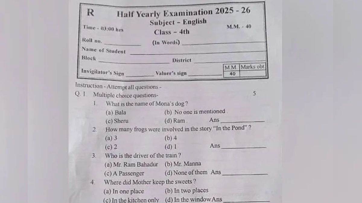 शिक्षा सत्र 2025-26 के तहत आयोजित अर्द्धवार्षिक परीक्षा में कक्षा चौथी के अंग्रेजी प्रश्न पत्र में एक सवाल पूछा गया था कि "मोना के कुत्ते का नाम क्या है?"। इस बहुविकल्पीय प्रश्न के उत्तर के लिए चार विकल्प दिए गए थे, जिनमें 'शेरू' के साथ 'राम' नाम का विकल्प भी शामिल था। इस मामले की शिकायत होने पर विभाग ने इसे गंभीरता से लिया और माना कि 'राम' हिंदू धर्म के आराध्य देव हैं और कुत्ते के नाम के विकल्प के रूप में उनका नाम देना धार्मिक भावनाओं को आहत करने वाला है। मामले में शिक्षा विभाग ने पांच सदस्यीय जांच कमेटी गठित की थी।