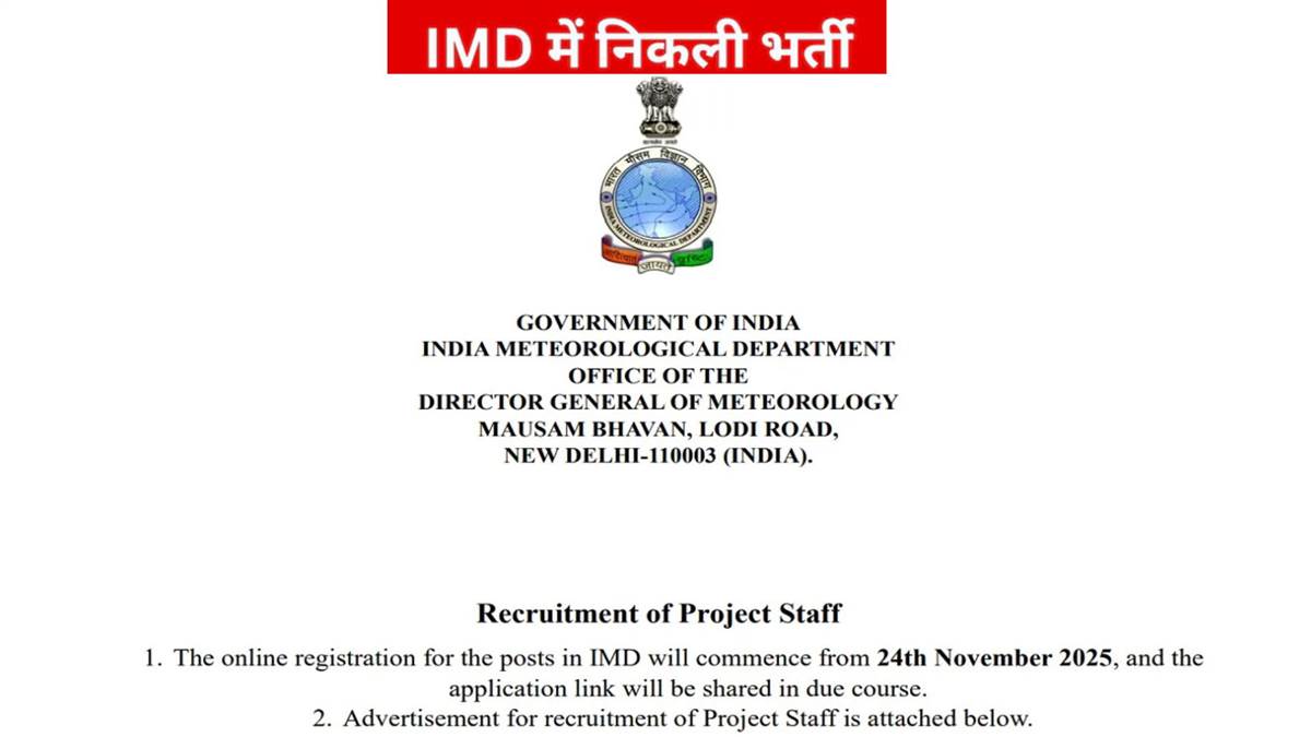 आवेदन प्रक्रिया 24 नवंबर 2025 से शुरू होगी और इच्छुक उम्मीदवार 14 दिसंबर 2025 तक ऑनलाइन आवेदन कर सकेंगे। ऑनलाइन आवेदन केवल mausam.imd.gov.in पर स्वीकार किए जाएंगे, ऑफलाइन फॉर्म मान्य नहीं होंगे।