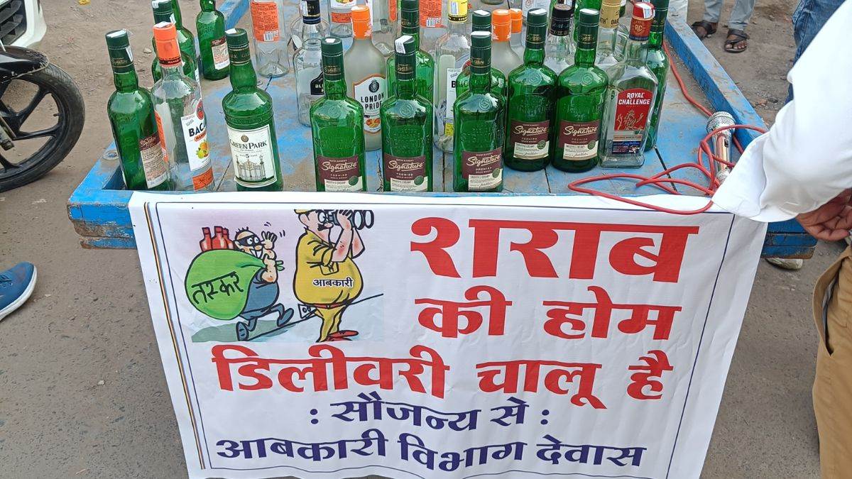 ठेले पर रखी शराब की बोतलें, लगाया पोस्टर- होम डिलीवरी चालू है... देवास में कांग्रेस का अनोखा प्रदर्शन