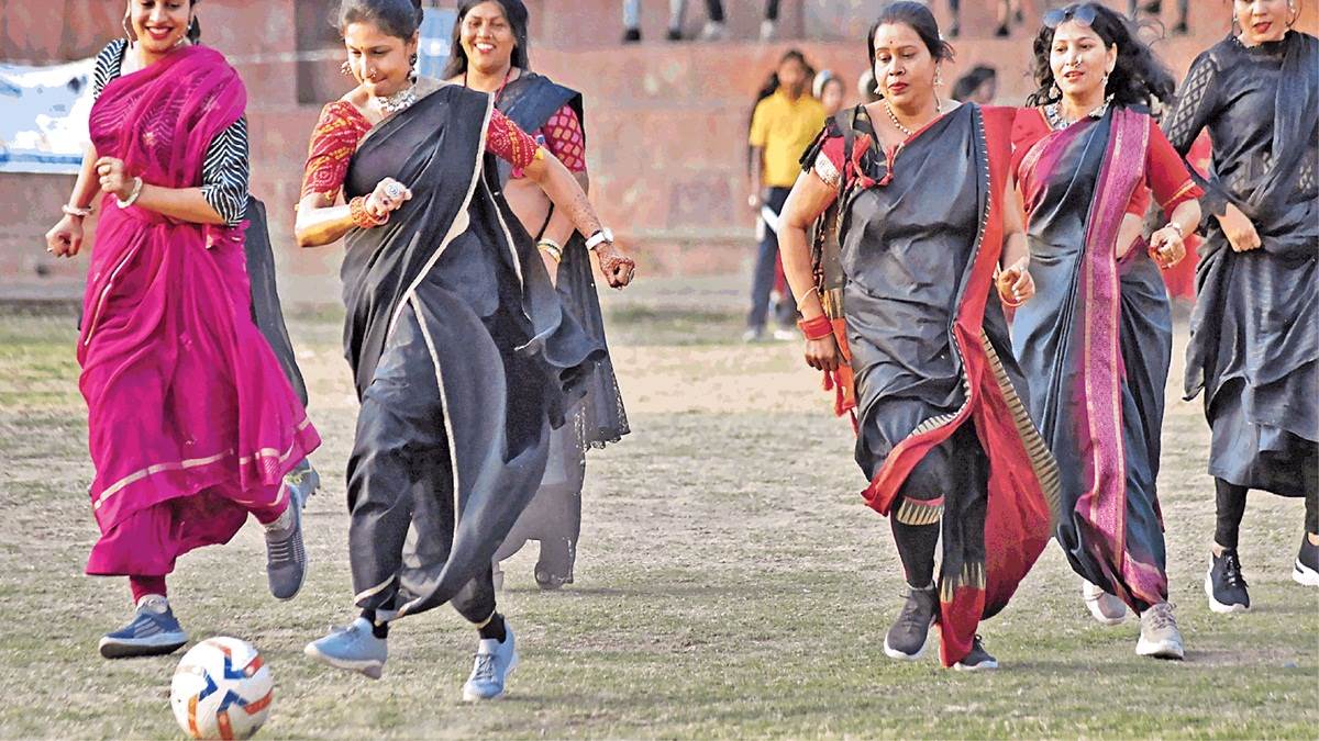 Football in saree: ग्वालियर. नईदुनिया प्रतिनिधि। समाजसेवा के साथ घर परिवार के काम में व्यस्त रहने वालीं महिलाओं का अंदाज पूरी तरह से बदला हुआ था। चेहरे पर जीत का भाव साफ नजर आ रहा था। बार-बार उनके कदम गोल दागने के लिए जमीन से उठ रहे थे। स्पर्धा में सभी धाकड़ नजर आ रही थीं। शहरवासियों ने मुग्ध कर देने वाला यह नजारा देखा शनिवार की शाम एमएलबी ग्राउंड में। यहां शाम ढलने के साथ जेसीआइ सीनियर मेंबर्स एसोसिएशन और नगर निगम का गोल इन साड़ी इवेंट शुरू हुआ। तय शेड्यूल के अनुसार सभी को फुटबाल मैच खेलना था। बाजी मारने के लिए इसमें स्पर्धा में आठ टीमें उतरी हैं। टीमों में शामिल कुछ महिलाएं स्वसहायता समूह से भी हैं। पहले दिन आठों टीमों के मैच हुए। रविवार को ठीक शाम चार बजे से सेमिफायनल और फायनल राउंड शुरू होगा।