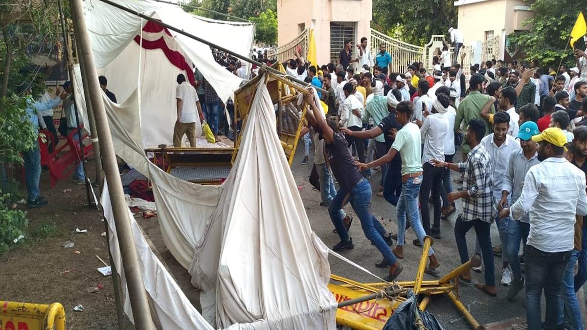 फूलबाग मैदान पर जब कार्यक्रम शुरू हुआ, तभी पुलिस के सामने ही हंगामा होने लगा। सड़क पर डिवाइडर पर लगी रेलिंग उखाड़ी गई, राहगीरों की गाड़ियां तोड़ी गई और उन्हें पीटा गया। इसके बाद गाड़ियों से समाज के लोग कलेक्ट्रेट रवाना हुए। वे कलेक्टर अक्षय कुमार सिंह को ज्ञापन देना चाहते थे। गेट पर पुलिस अधिकारी फोर्स के साथ तैनात थे।