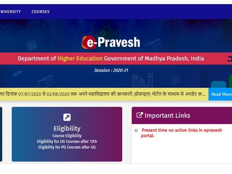Epravesh in MP : इंदौर (नईदुनिया प्रतिनिधि)। मध्य प्रदेश के कॉलेजों में दाखिले की प्रक्रिया शुरू हो गई है। इसमें पारंपरिक पाठ्यक्रमों के साथ ही बीएड-एमएड समेत दो दर्जन से ज्यादा कोर्स के लिए ऑनलाइन पंजीयन किए जा सकेंगे। आवेदन करने के बाद विद्यार्थियों को तुरंत पसंदीदा कॉलेजों के लिए नाम देने होंगे। दस्तावेजों का ई-सत्यापन करवाना होगा। मध्य प्रदेश के 1400 निजी, सरकारी और अनुदान प्राप्त कॉलेजों में एमपी ऑनलाइन के जरिए विद्यार्थी आवेदन कर सकते हैं। बीए, बीकॉम, बीएससी, एमए, एमकॉम और एमएससी, एलएलबी, बीएएलएलबी, एलएलएम समेत अन्य कोर्स शामिल हैं। पारंपरिक पाठ्यक्रम में दाखिले के लिए काउंसलिंग का सिर्फ एक ही चरण रखा है जबकि कॉलेज लेवल काउंसलिंग यानी सीएलसी में दो चरण होंगे। इन पाठ्यक्रमों के लिए महीनेभर में प्रक्रिया 30 अगस्त पूरी करनी होगी।