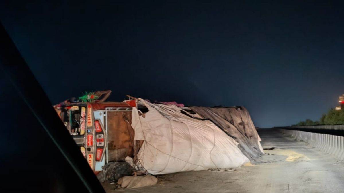धान लेकर जा रहा ट्रक ब्रिज पर असंतुलित होकर पलटा
