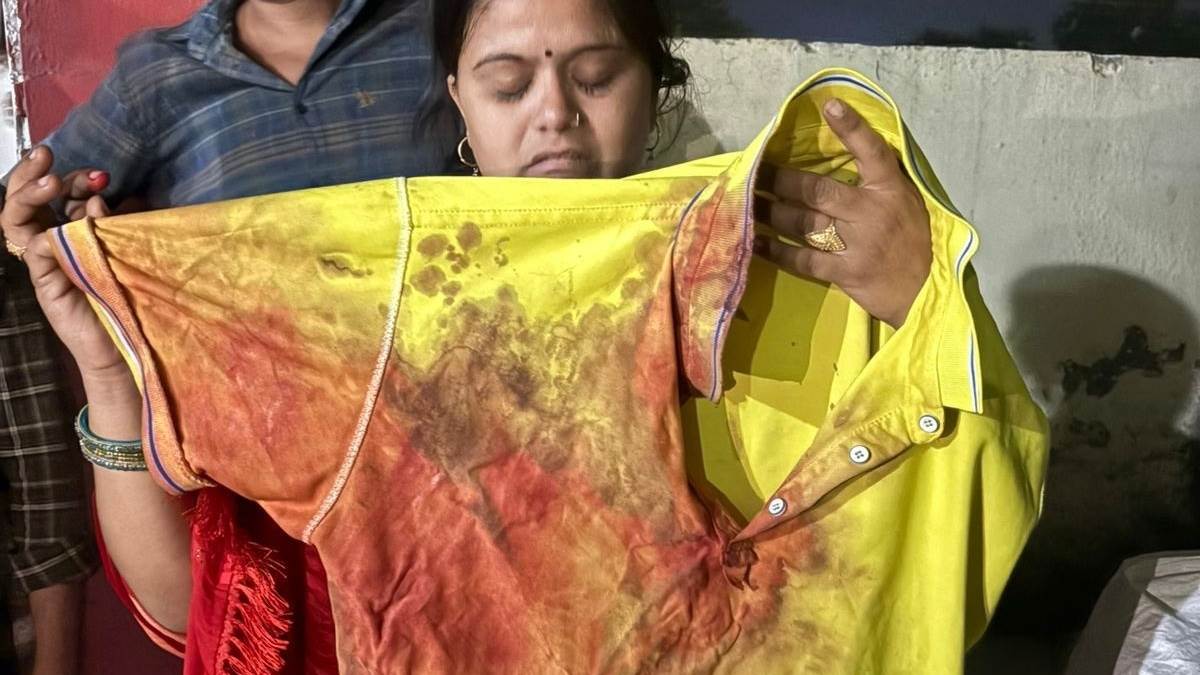जीआरपी थाने में घायल पति की खून से सनी टीशर्ट दिखाती वंदना शर्मा।HighLights