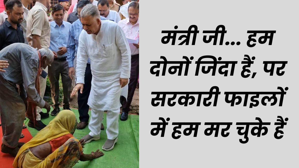 तभी वहां पर कागजों में मृत वृद्ध पहुंचे और उन्होंने सभी के सामने प्रभारी मंत्री के पैरों के सामने नतमस्तक होकर गुहार लगाते हुए अपनी आप बीती सुनाई और कहा कि साहब अभी हम जिंदा हैं।