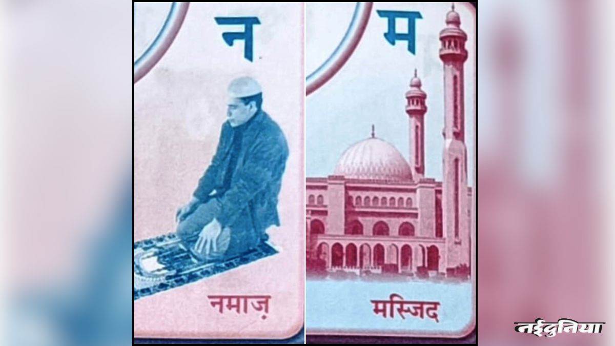 यह मामला तब सामने आया जब स्कूल की नर्सरी कक्षा में पढ़ने वाली एक छात्रा के परिजन ने उसकी किताबें देखी। उन्होंने 'औ से औरत हिजाब में थी' पढ़ने के बाद अन्य शब्दों पर ध्यान दिया। इसमें 'क से कबूतर' की जगह 'क से काबा', 'म से मस्जिद' और 'न से नमाज' लिखा था। इस पर परिजनों ने आपत्ति जताई।