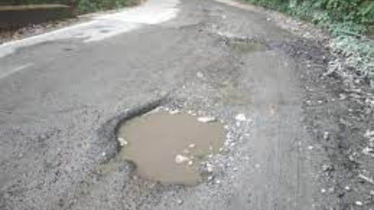 धंसकने से हुए गड्ढे, डामर भी उखड़ा