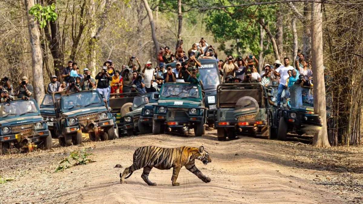 बांधवगढ़ में पर्यटकों की जिप्सियों के सामने से गुजरता बाघ। फाइल फोटो, सौजन्य चेतन घरपुरेHighLights