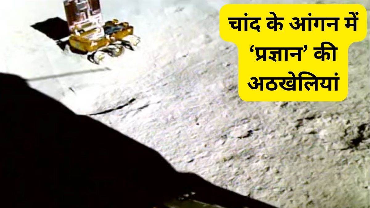 Chandrayaan 3 Rover Pragyan। चंद्रयान-3 मिशन का रोवर प्रज्ञान (Pragyan Rover) चांद की सतह पर जब से गया है, तब से लगातार चांद की सतह पर चहलकदमी कर रहा है। रोवर अभी तक चांद के बारे में कई अहम जानकारी जुटा चुका है। इस बीच रोवर प्रज्ञान का चांद पर मस्ती भरे अंदाज में चहलकदमी करते हुए एक वीडियो सामने आया है। इस वीडियो में देखा जा सकता है कि रोवर प्रज्ञान सुरक्षित रास्ते की तलाश के कैसे खुद को टर्न कर रहा है। रोवर के इस रोटेशन को लैंडर विक्रम के कैमरे से कैप्चर किया गया है।
