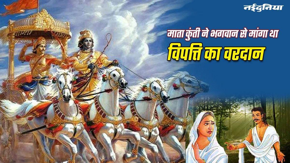 पौराणिक कथाओं में हमने अक्सर पढ़ा और सुना है कि भगवान जब दर्शन देते हैं तो भक्त अपने लिए वरदान में कुछ अच्छी मांग करते हैं, लेकिन एक मात्र देवी कुंती ही ऐसी थी, जब उन्हें भगवान ने दर्शन दिए थे तो उन्होंने वरदान में विपत्ति की मांग की थी। महाभारत के उद्योग पर्व में इसका उल्लेख मिलता है। देवी कुंती ने कष्ट से बचकर कभी भी सुख, आराम और राज्य की कामना नहीं थी। देवी कुंती के व्यवहार में सत्ता लोलुपता नहीं थी।