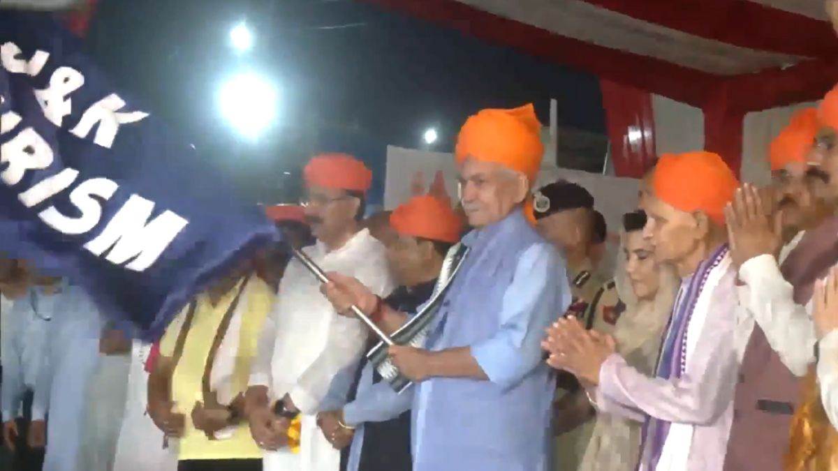 #WATCH | Jammu | J&K LG Manoj Sinha flags off the first batch of pilgrims for Shri Amarnath Yatra starting today pic.twitter.com/OAsRfkZQUC