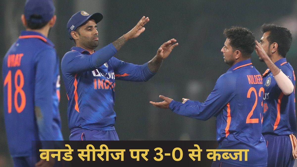 India vs New Zealand 3rd ODI: भारत और न्यूजीलैंड के बीच तीन मैचों की वनडे सीरीज के आखिरी मुकाबले में एक बार फिर टीम इंडिया ने शानदार जीत दर्ज की। इसके साथ ही टीम इंडिया ने 3-0 से सीरीज पर कब्जा जमा लिया है। साथ ही ICC की वनडे रैंकिंग में अब टीम इंडिया नंबर वन पर पहुंच गई है। इंदौर के होलकर स्टेडियम में खेले जा रहे इस मैच में भारत ने पहले बल्लेबाजी करते हुए 385 रनों का विशाल स्कोर खड़ा कर दिया। जवाब में न्यूजीलैंड की टीम 41.2 ओवरों में 295 रनों पर ही सिमट गई। इस तरह भारत ने तीसरे वनडे में 90 रनों से शानदार जीत दर्ज की। न्यूजीलैंड की ओर से केवल डेविड कॉन्वे टिककर बल्लेबाजी कर सके। उन्होंने 100 गेंदों में 138 रन बनाये। उनके अलावा हेनरी निकल्स ने 42 और मिचेल सैंटनर ने 34 रनों की योगदान दिया। भारत की ओर से शार्दूल ठाकुर और कुलदीप यादव ने 3-3 विकेट लिए।