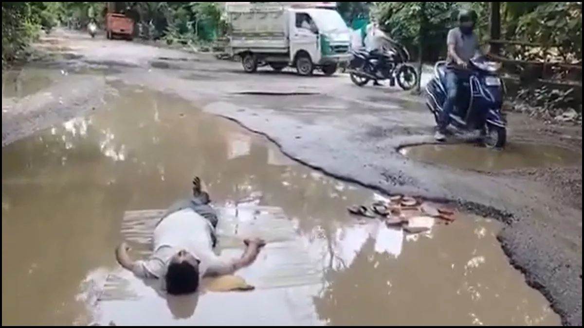 ब्यूरो, कानपुर। यूपी के कानपुर में रविवार को सड़क पर अजीबोगरीब नजारा देखने को मिला। एक शख्स तकिया और चटाई लेकर भरे कीचड़ में लेट गया। पिता, अपनी बेटी के स्कूल जाते समय टूटी सड़क पर गिर जाने से नाराज था। उनकी बेटी शनिवार को सड़क पर गिरी थी। वह भरे कीचड़ में लेट कर प्रदर्शन करने लगा। नाराज पिता के प्रदर्शन का एक कथित वीडियो भी सोशल मीडिया पर वायरल हो रहा है।